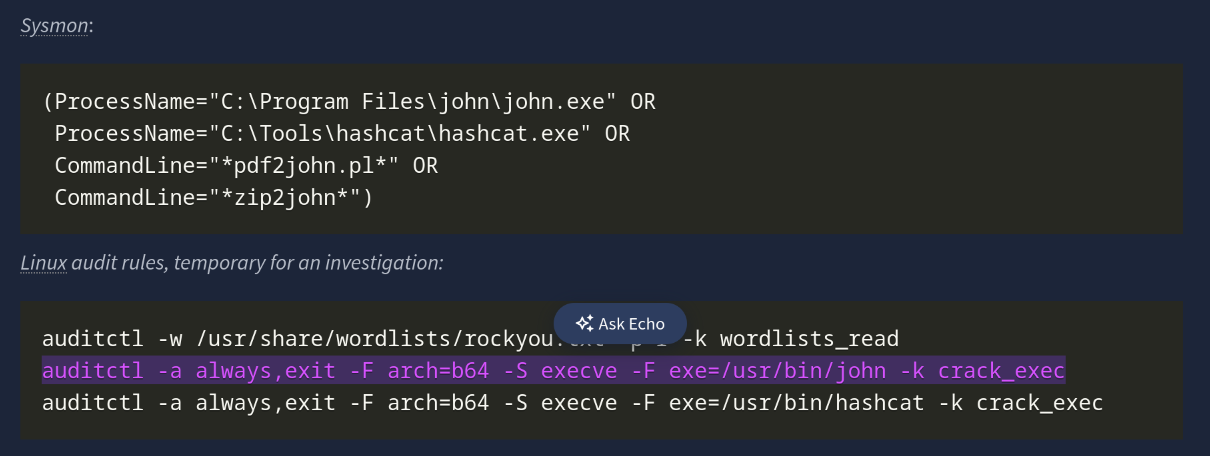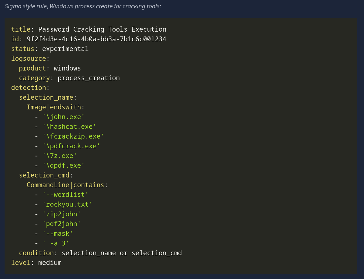 Offline cracking does not hit login services, so lockouts and failed logon dashboards stay quiet. We can detect the work where it runs, and endpoints jump boxes. The important signals to monitor include: