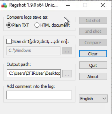 To do this, I’m going to use a tool called Regshot. Regshot works by creating to snapshots of the system, one before the sample is run and one after the sample is run. The results are then compared to identify changes.
