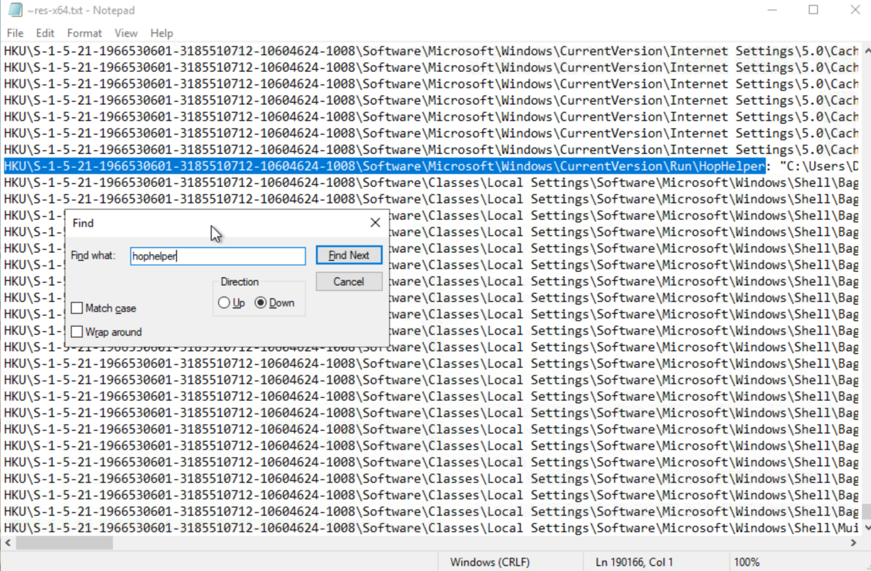 After Running Regshot and searching the given log for the search term “hophelper” (the malware sample is hophelper.exe), I found the flag I was looking for.