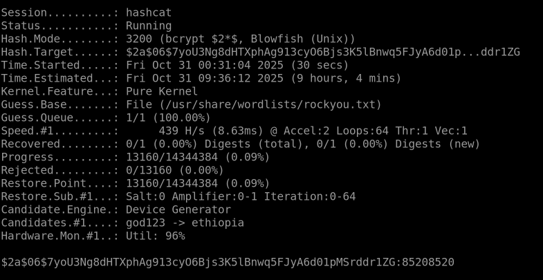 hashcat -m 3200 -a 0 hash1.txt /usr/share/wordlists/rockyou.txt
