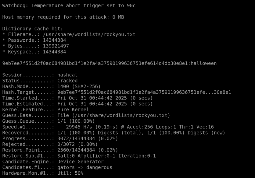 hashcat -m 1400 -a 0 hash2.txt /usr/share/wordlists/rockyou.txt