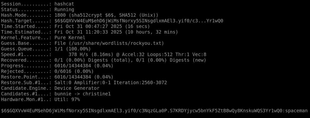 hashcat -m 1800 -a 0 hash3.txt /usr/share/wordlists/rockyou.txt
