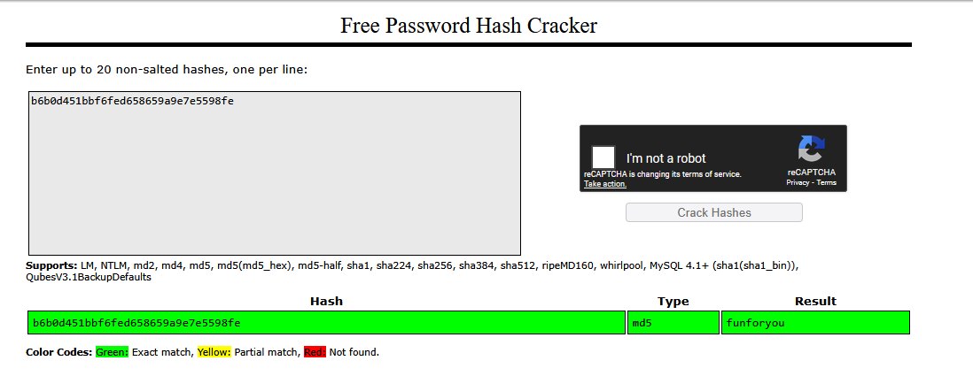 With no prefix to go off here, I was unsure if I could use hashcat to crack this one. So I went to crackstation.net and entered the hash there. It returned the value funforyou as hash-type md5. This was correct!